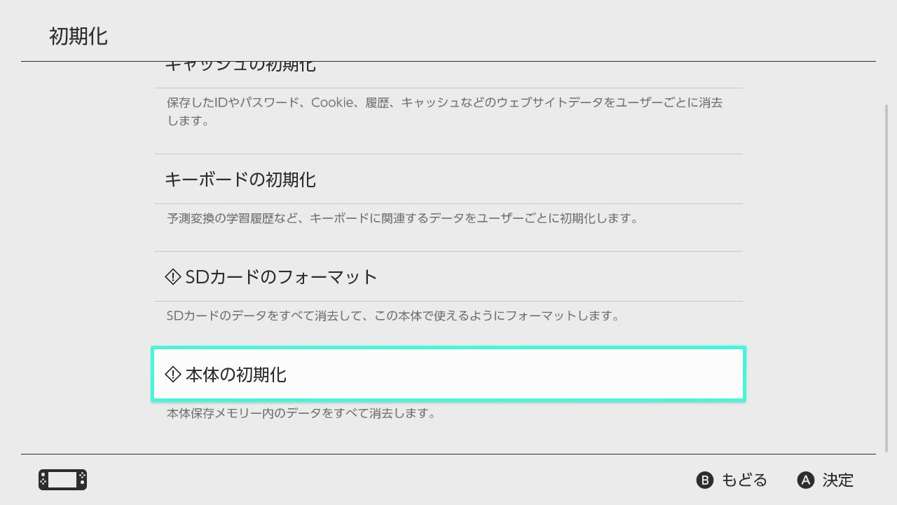 初期化すると、ソフトやセーブデータ、ユーザー情報などが消去され、ニンテンドーアカウントの連携も解除されます(「いつもあそぶ本体」の設定も解除されます)。